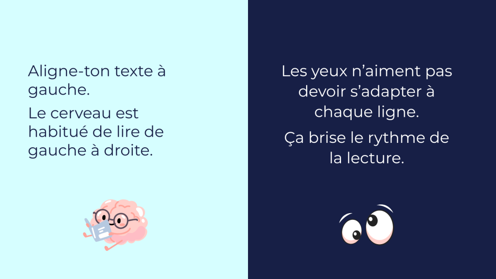 Notre cerveau est habitué à lire de gauche à droite. Un texte centré ou justifié peut ralentir la lecture ou créer une impression de déséquilibre. En alignant tes textes à gauche, tu facilites la lecture tout en donnant un aspect plus professionnel à ta présentation.
